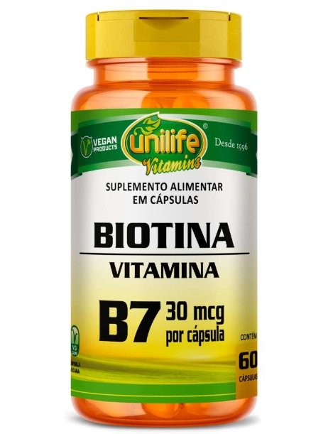Biotina 30mg 60 cápsulas Unilife é um suplemento alimentar que fornece biotina, também conhecida como vitamina B7, essencial para o metabolismo de carboidratos, proteínas e gorduras. Entre seus principais benefícios estão o fortalecimento da saúde da pele, cabelos e unhas, promovendo brilho, resistência e crescimento saudável. Também contribui para o metabolismo energético, auxiliando na conversão dos alimentos em energia, e apoia o funcionamento adequado do sistema nervoso. A apresentação em cápsulas facilita o consumo diário, sendo indicada como complemento alimentar com orientação de profissional de saúde.